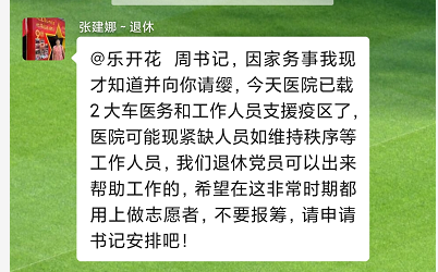 退休在家的退休党支部支委张建娜看到医院抗疫消息,多次打电话给支部书记请缨“参战”。6月4日,得知医院派出志愿者支援金星社区核酸检测采样工作,张建娜第一时间电话请缨,“我有空,用我吧!”退休党支部书记周瑾考虑到张建娜的身体状况,婉言拒绝了她的请求。