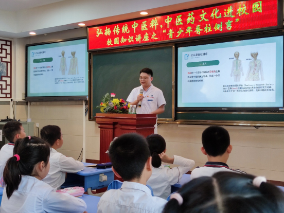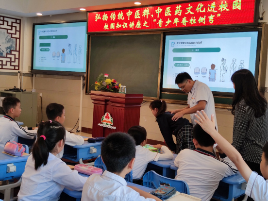 10月18日下午,由我院与赤岗东小学联合开展的“中医药文化进校园”项目邀请医院骨伤科青年文明号苗广甫医师为赤岗东小学做《青少年脊柱侧弯》授课,为120余名小学生生动诠释了“坐如钟、站如松、行如风、卧如弓”的重要意义,深受听课学生喜爱。