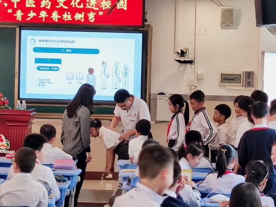 互动环节,苗医生带领学生们实践脊柱侧弯一般检测法——目测法,并以目测法为20余名小学生做脊柱侧弯筛查。