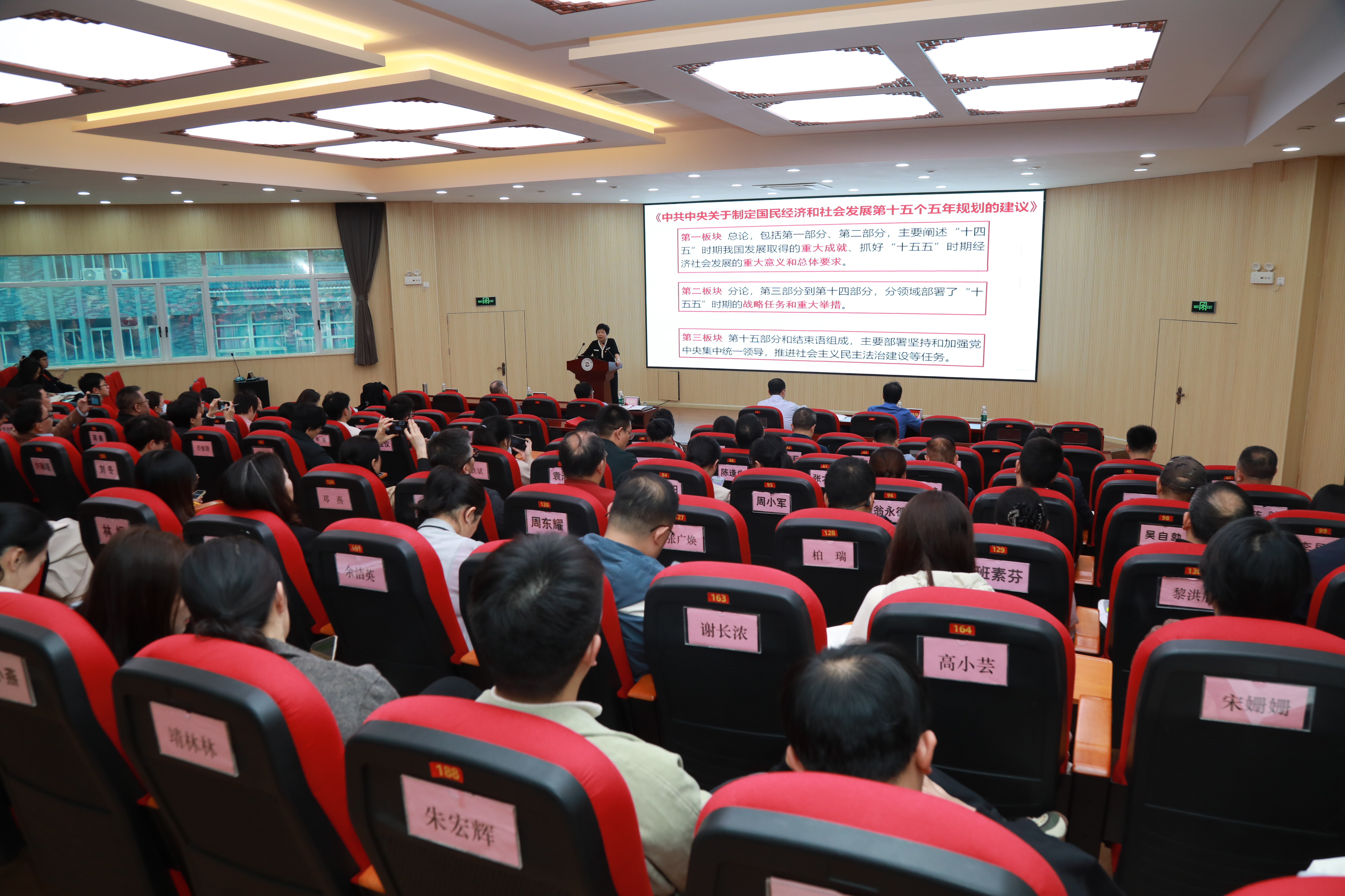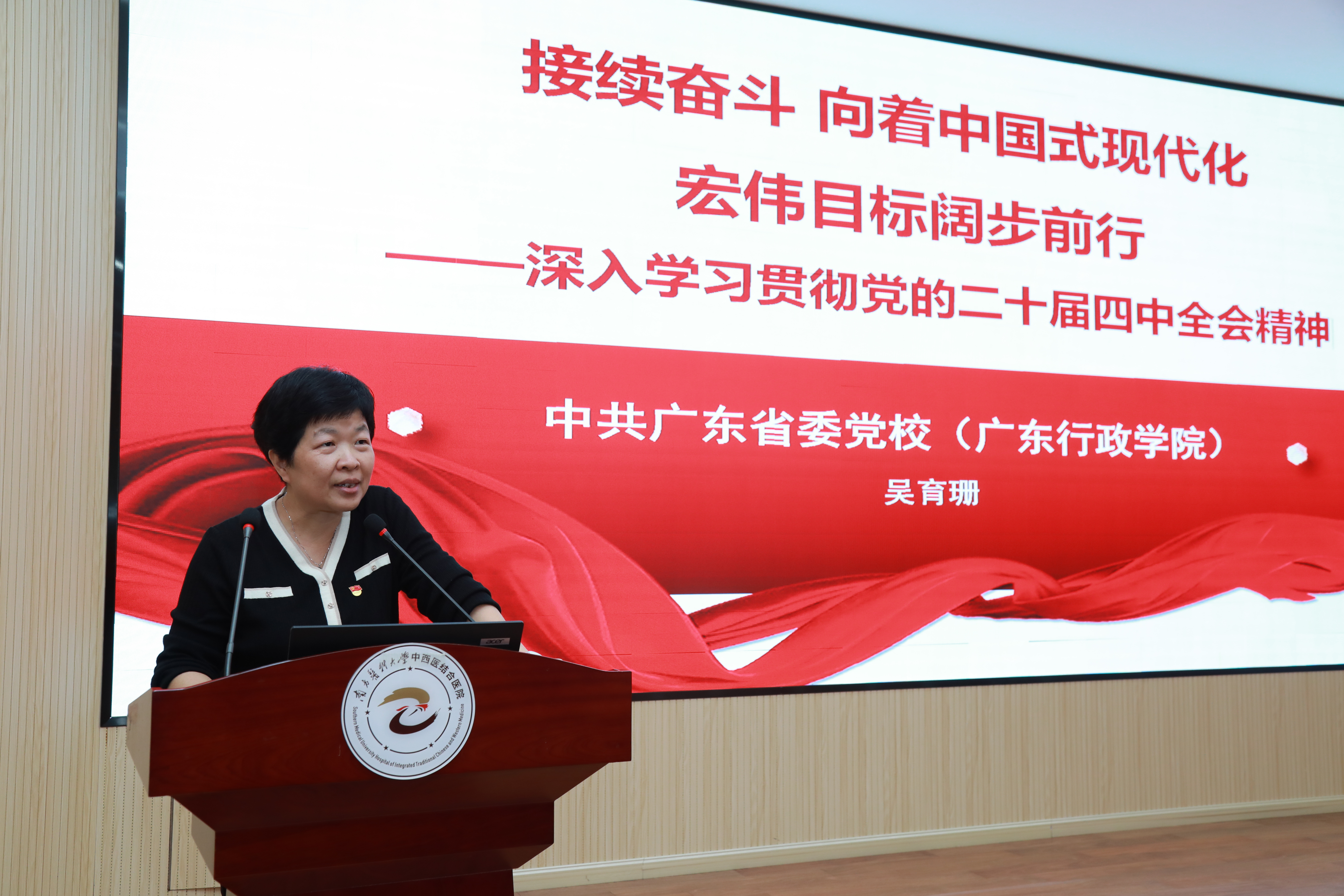 会上,吴育珊教授围绕“接续奋斗 向着中国式现代化宏伟目标阔步前行”主题,从政治、经济、科技等多维度深入解读,引导大家系统把握全会核心要义,深刻认识当前国内外形势,以及“十五五”时期的战略任务与重大举措。