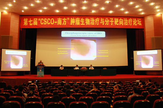 2013年8月16-18日,由中国抗癌协会(CACA)临床肿瘤学协作专业委员会(CSCO)和广州抗癌协会(GACA)主办,广东省医学会肿瘤学分会和南方医科大学中西医结合肿瘤中心承办的“第七届‘CSCO-南方’肿瘤生物治疗与分子靶向治疗论坛暨第十二届全国肿瘤综合诊疗新进展研讨会”在广州军区珠江宾馆举行。在开幕式上,大会主席、广东省医学会肿瘤学分会主任委员、CSCO副主席、南方医院副院长兼肿瘤中心主任、南方医科大学中西医结合中心主任罗荣城院长致欢迎辞。