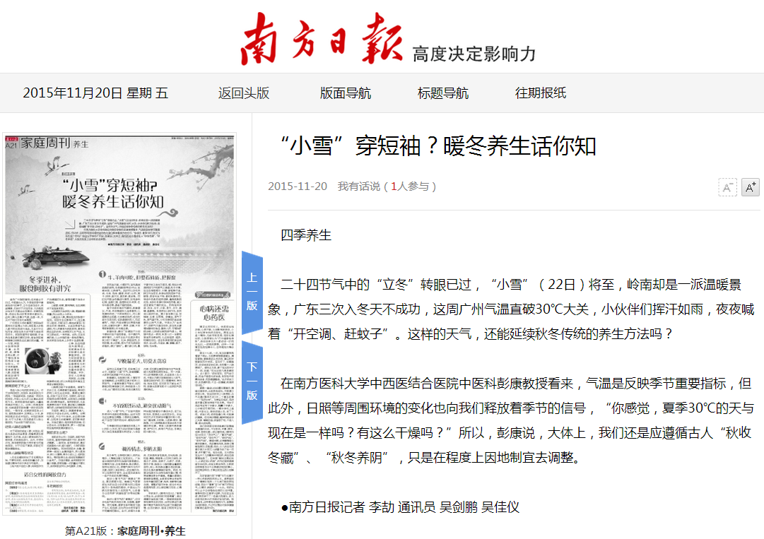 二十四节气中的“立冬”转眼已过,“小雪”(22日)将至,岭南却是一派温暖景象,广东三次入冬天不成功,这周广州气温直破30℃大关,小伙伴们挥汗如雨,夜夜喊着“开空调、赶蚊子”。这样的天气,还能延续秋冬传统的养生方法吗?
