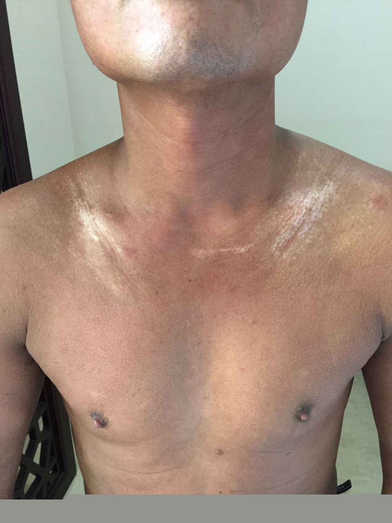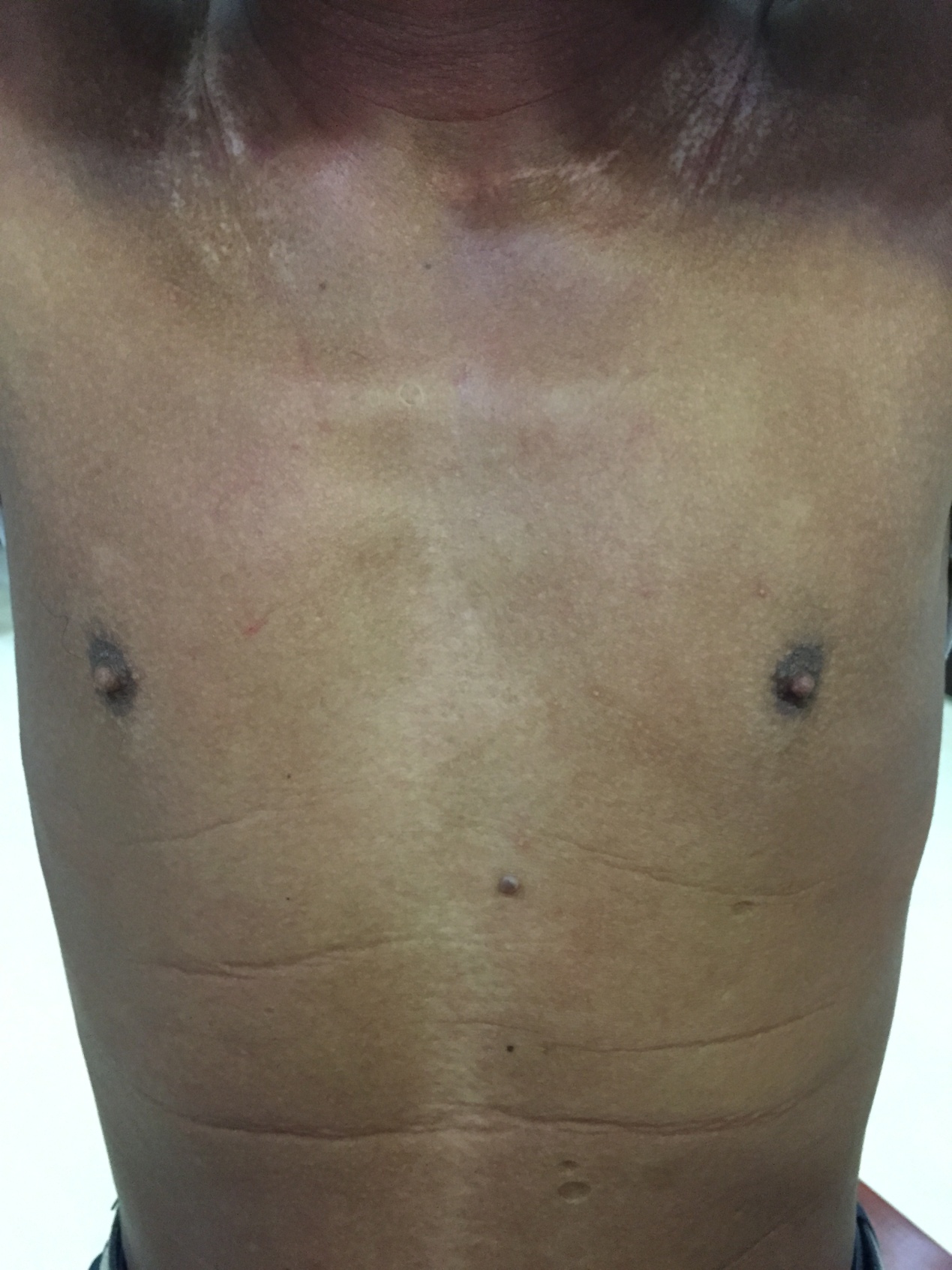治疗前,胸腹部皮肤增厚变硬,弹性差,呈板状。颈胸部色素脱失