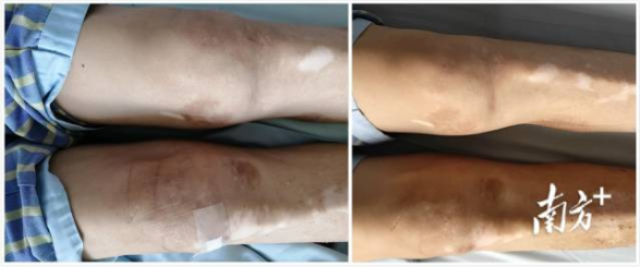 光动力治疗第一次和第二次对比,患者右膝关节明显消肿。