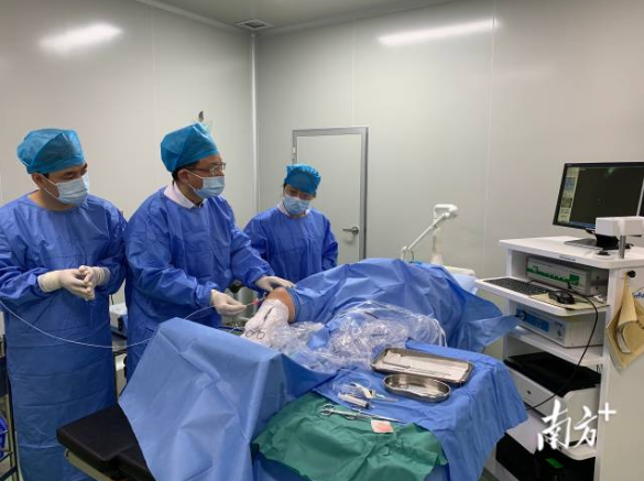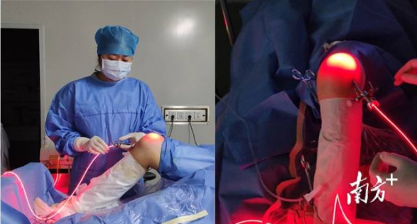针对滑膜炎的特性,肖长虹团队为周阿姨病变严重的双膝开展光动力治疗,通过在关节腔内注射光敏剂,2个小时之后局部开一个微小的口插入激光道,在微创针刀镜直视下照射关节腔内侧滑膜,诱导滑膜成纤维细胞及炎症细胞凋亡及坏死,达到滑膜切除的效果。