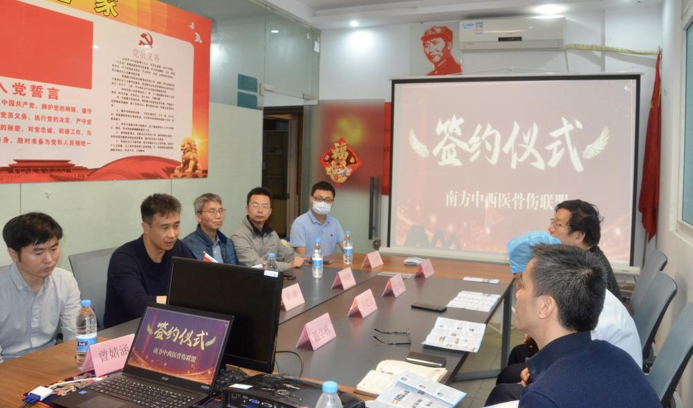 2022年3月25日下午,南方中西医骨伤联盟又加入新成员,我院骨伤科主任黄刚、汪青春教授、健康管理科王佳勇主任、及科室相关负责人、广州市海珠区华洲街社区卫生服务中心中心主任雷志强、中心副主任高建宏、中心党支部副书记温学栋、中心副主任樊霞玲参加交流座谈会议。会议上,双方举行签约仪式及南方中西医骨伤联盟授牌仪式。