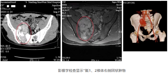 随后小陈在当地医院做了腰椎+骶尾椎增强MR检查,结果显示“骶1、2椎体右侧团状肿物,考虑恶性肿瘤,恶性神经源性肿瘤与骨巨细胞瘤待鉴别”,就诊医生表示小陈右腿胀痛麻木的原因是由肿瘤压迫神经导致的,建议去上级医院就诊。