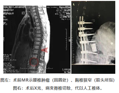 今年2月份,周阿姨突然出现排尿困难,足底发麻的情况,实在难以忍受便在当地医院做了检查,结果提示腰椎肿物。于是慕名来到我院就诊。