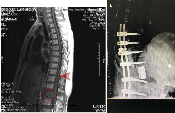 图左:术前MR示腰椎肿瘤(圆圈处)、胸椎狭窄(箭头所指)