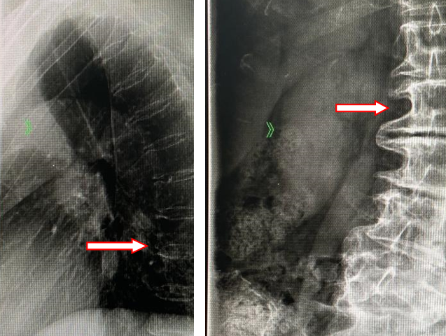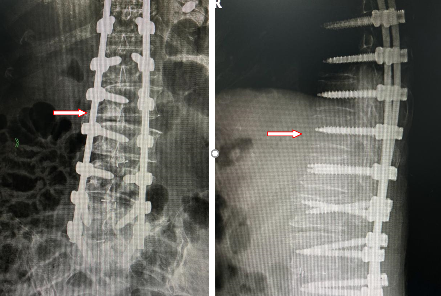 红色箭头处,为术前腰椎侧弯畸形及胸椎后凸畸形