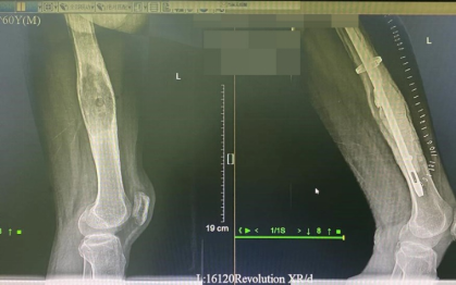 直到近一年来,疼痛越来越剧烈,无法忍受才到南方医科大学中西医结合医院接受全面检查,DR检查结果让人触目惊心:发现左股骨中下段肿瘤,而且肿瘤已经完全把左股骨髓腔给侵蚀掉了。