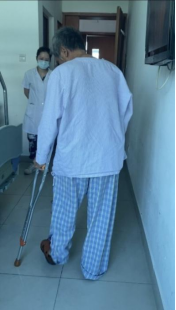 莫阿叔在医生指导下助拐杖下床行走
