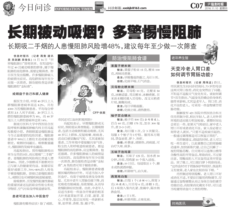 冯起校表示,慢阻肺患者除遵循医嘱药物治疗外,可适当加入中医食疗,有助于病情改善及身体恢复。尤其中老年人胃肠功能下降,消化吸收功能减弱,易致便秘,从而导致慢阻肺症状加重。由此,中老年人应适当多吃一些富含纤维素的粗茎大叶类蔬菜如芥菜、白菜、菠菜、菜心、芹菜等,饭后宜再吃一些新鲜水果,如苹果、香蕉、梨、橘子等。