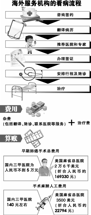 出国看个病价格到底要多少呢?记者发现,海外服务机构的看病流程一般为咨询签约、翻译病历、推荐医院和专家、办理签证、安排行程及陪诊等,这些杂费再加上治疗费用,去美国看病至少是国内费用的20倍。南方医科大学中西医结合医院胸部肿瘤内科与呼吸内科主任冯起校称,撇开杂费不说,单就一台手术的费用而言,美国就远比中国要昂贵得多。“以早期肺癌的肺叶切除手术为例,国内三甲医院的总费用不到5万元,而美国麻省总医院的费用约2万6千美元;在国内三甲医院,手术麻醉人工费用在140元左右,而美国麻省总医院的费用则高达3500美元。在美国进行癌症治疗,入院平均起价为10万美元,如果长期治疗,则费用远不止于此。”