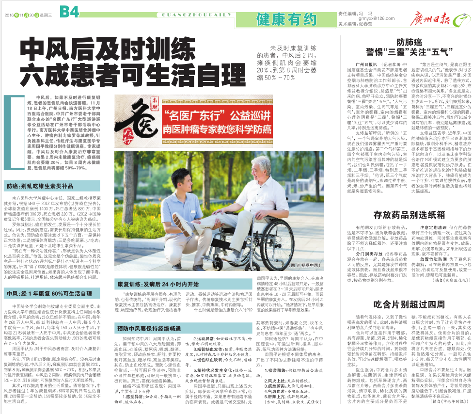 中风后,如果不及时进行康复锻炼,患者的患侧肌肉会快速萎缩。11月18日上午,广州日报、南方医科大学中西医结合医院、中共广州市委老干部局联合主办的“名医广东行”大型巡讲巡诊公益活动在广州市老干部活动中心举行。南方医科大学中西医结合肿瘤中心主任、肿瘤内科专家罗荣城教授,针灸推拿科主任、传统疗法与康复医学专家周国平教授分别作健康讲座。专家提醒,中风后及时介入康复治疗非常重要。如果2周内未做康复治疗,瘫痪侧肌肉会萎缩20%,如果8周内未做康复,患侧肌肉将萎缩50%~70%。