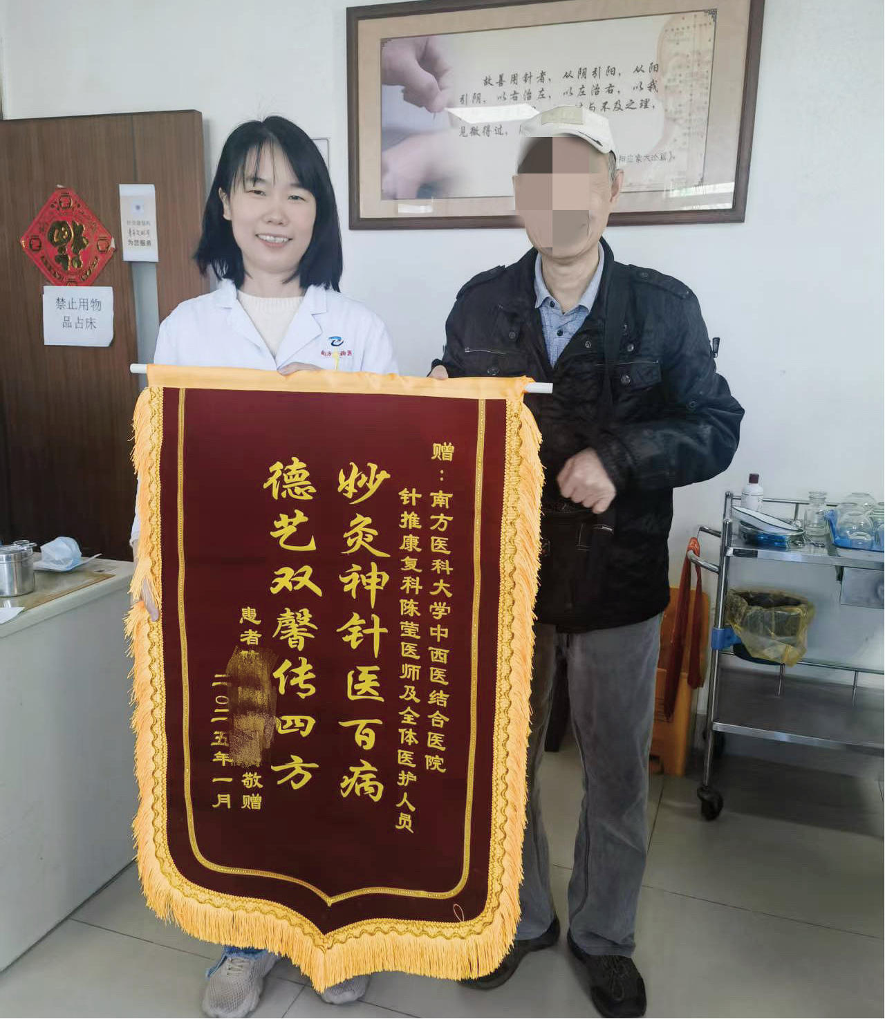 “何似神医胜华佗,亮剑一挥斩病魔” 几个大字格外醒目。患者回忆看病的过程,感慨万千:“被这个病折磨得痛苦不堪,刚入院时心情极度低落。医生治疗师们不仅医术高超,精准地制定治疗方案,主管医师赵爱梅还时刻关注我的情绪,不断鼓励我。护士们也无微不至,耐心叮嘱注意事项,让我感受到家一般的温暖。陈莹医师德艺双馨,针到病除。是他们给了我战胜病魔的勇气和信心。” 经过中西医结合的治疗,病情逐渐好转。
