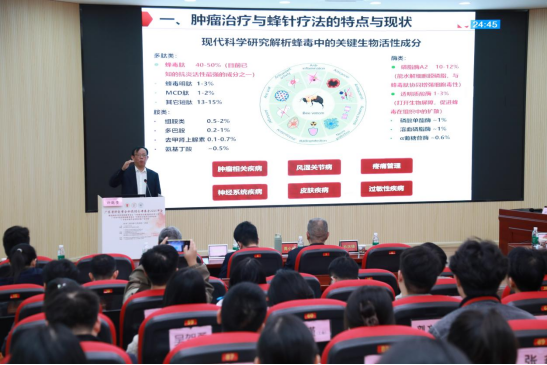 本次学术交流环节亮点纷呈,国内中医药领域的知名专家学者轮番登场,带来了一场场兼具理论高度与临床深度的学术盛宴。国家“973计划”首席科学家、岐黄学者许能贵教授以《蜂针疗法的传承与创新:从抗肿瘤应用进展到纳米蜂针经皮治疗新策略》为题(图3),系统阐述了蜂针疗法的传承脉络与现代创新成果,其提出的纳米蜂针经皮治疗新策略为传统疗法的现代化应用提供了新思路。