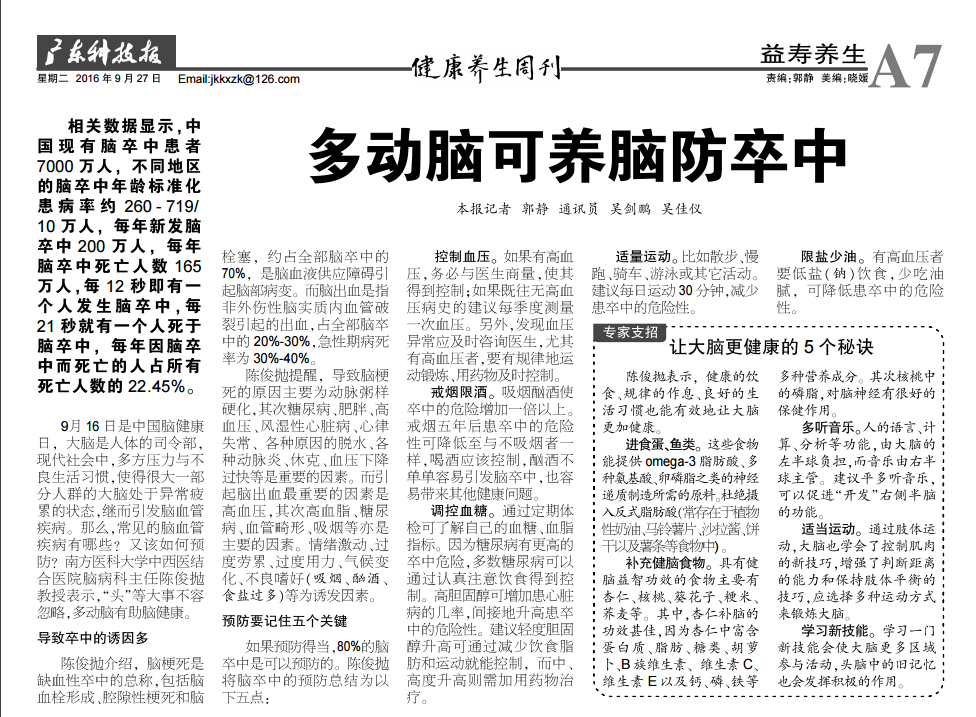 9月16日是中国脑健康日,大脑是人体的司令部,现代社会中,多方压力与不良生活习惯,使得很大一部分人群的大脑处于异常疲累的状态,继而引发脑血管疾病。那么,常见的脑血管疾病有哪些?又该如何预防?南方医科大学中西医结合医院脑病科主任陈俊抛教授表示,“头”等大事不容忽略,多动脑有助脑健康。
