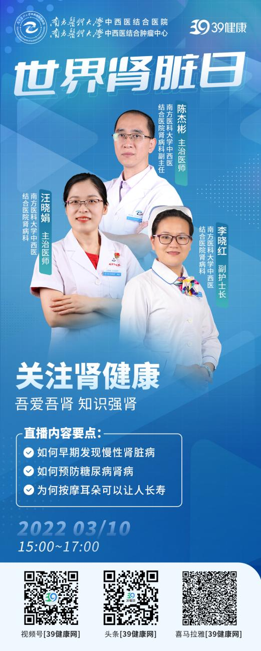 2022年3月10日是第17个世界肾脏日,今年的主题是“人人享有肾脏健康:吾爱吾肾,知识强肾”。为响应全民健康教育的号召,提高大众健康素养,南方医科大学中西医结合医院肾病科团队在39健康网络平台开展了线上直播科普和咨询服务,向大众传递护肾知识,维护肾脏健康,防控肾脏疾病,吸引了超2000名观众在线收看,破万点赞,提问热烈。