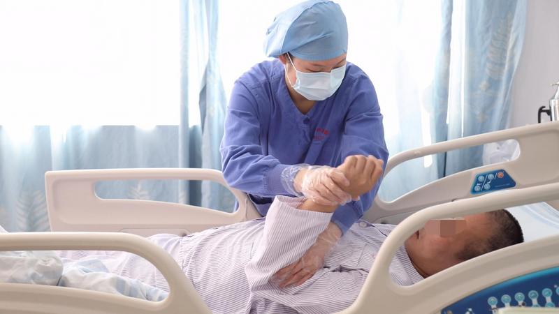 ▲护士帮助“无名氏”做肢体康复运动