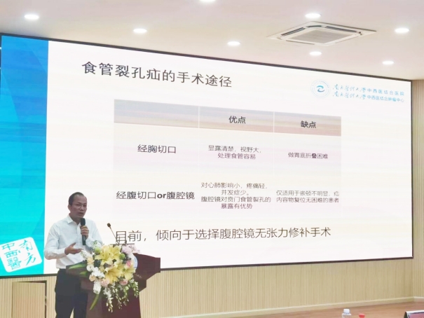 第二部分内容为食管裂孔疝术的外科手术治疗,周太成教授做《对抗反流手术适合人群及手术方式选择》专题报告,主要介绍食管裂孔疝的分型、腔镜修补以及修补后重建抗反流结构的方式选择。张才铭主任做《食管裂孔疝的微创手术治疗》专题报告,主要介绍食管裂孔疝的分型、急诊及择期手术指征,着重介绍食管裂孔疝腔镜下手术的简易七步法,对食管裂孔疝的手术方式进行了深入、细致的讲解。