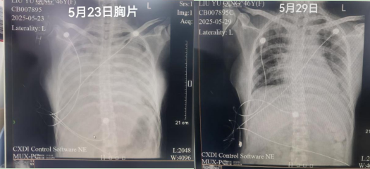 患有多年红斑狼疮和甲亢的刘阿姨,因长期服用免疫抑制剂,免疫系统早已成为病原体侵袭的 "薄弱地带"。5 月 23日,持续高热和进行性呼吸困难让她在外院治疗陷入僵局,紧急转入我院 ICU 时,她只能依靠100%纯氧维持呼吸,胸部CT显示双肺已呈“白肺”,情况十分危急。