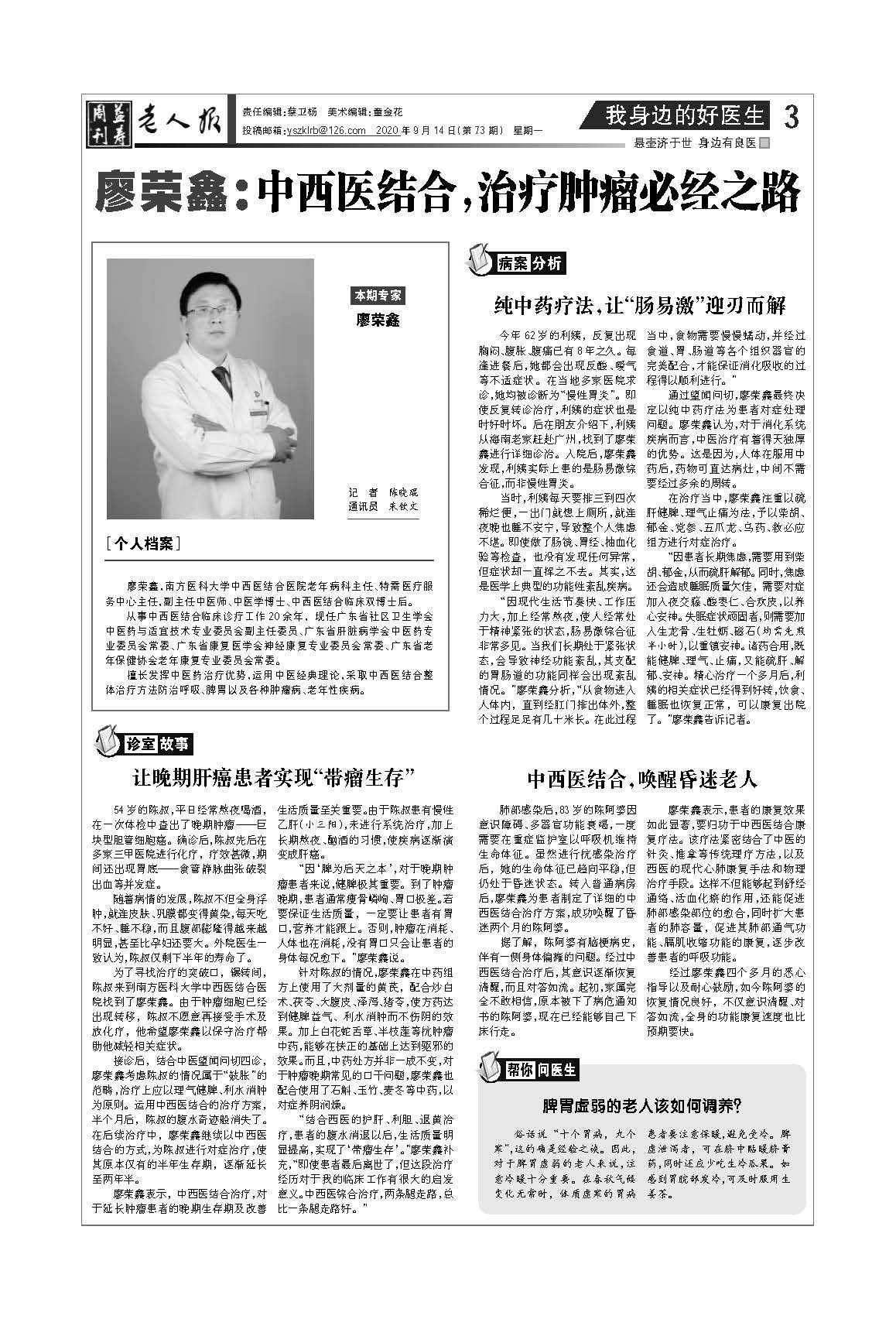 “结合西医的护肝、利胆、退黄治疗,患者的腹水消退以后,生活质量明显提高,实现了‘带瘤生存’。”廖荣鑫补充,“即使患者最后离世了,但这段治疗经历对于我的临床工作有很大的启发意义。中西医综合治疗,两条腿走路,总比一条腿走路好。”