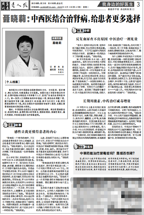 “很多人觉得中药会伤肾,觉得中医不能治肾病,但这些其实都是误解。中医用得好,不仅可以起到与西医同样的治疗效果,甚至解决一些西医治不了的问题,如血尿。”聂晓莉说。