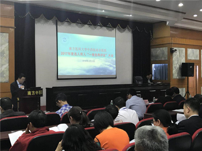 为进一步加强干部选拔任用工作的民主监督,根据《中共广东省委组织部关于做好2017年度选人用人“一报告两评议”工作的通知》精神及学校工作部署,医院对2017年度选人用人工作进行了认真回顾和自查,并于3月22日下午组织召开了医院首次选人用人“一报告两评议”会议。会议由彭康常务副书记主持。学校组织部赵为民部长、彭浩副部长,院领导,科室主任、副主任,副高级以上专业技术人员,职工代表共110人参加了会议。