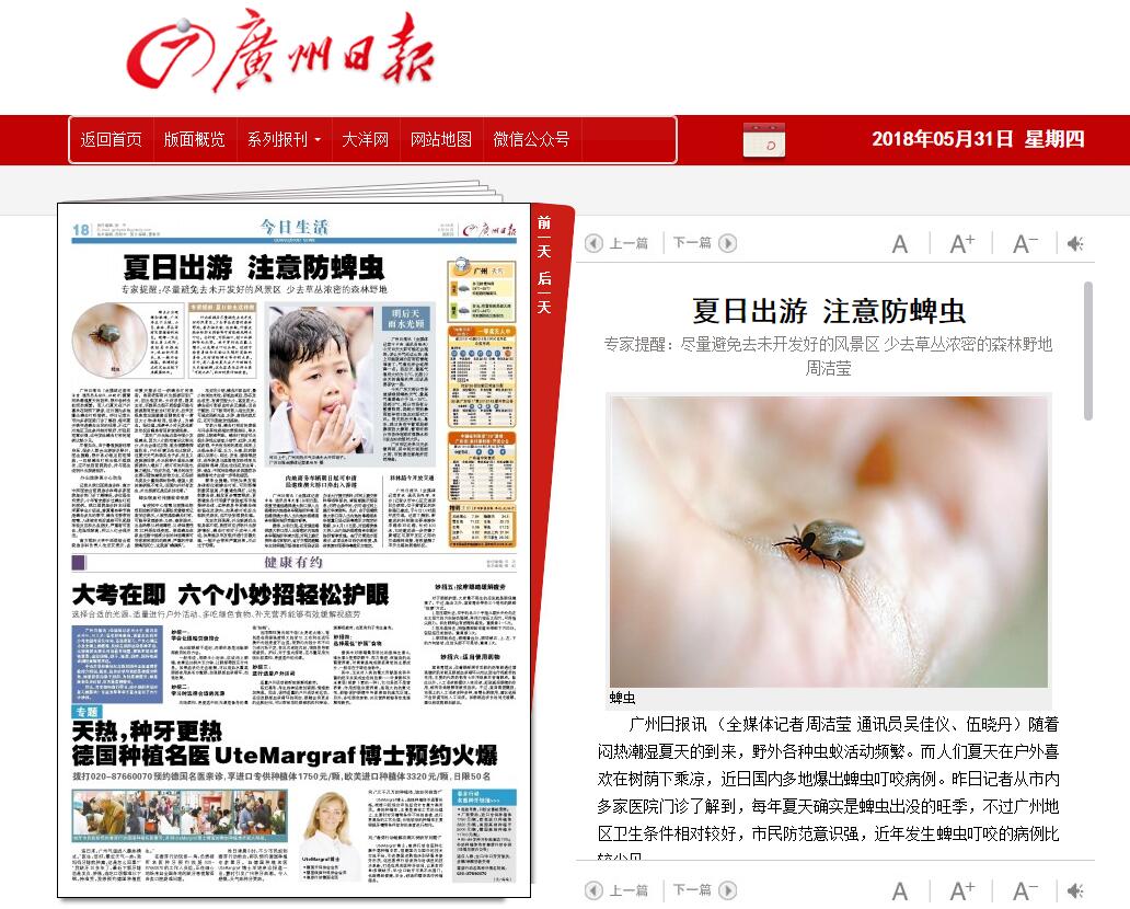 广州日报讯(全媒体记者周洁莹 通讯员吴佳仪、伍晓丹)随着闷热潮湿夏天的到来,野外各种虫蚁活动频繁。而人们夏天在户外喜欢在树荫下乘凉,近日国内多地爆出蜱虫叮咬病例。昨日记者从市内多家医院门诊了解到,每年夏天确实是蜱虫出没的旺季,不过广州地区卫生条件相对较好,市民防范意识强,近年发生蜱虫叮咬的病例比较少见。