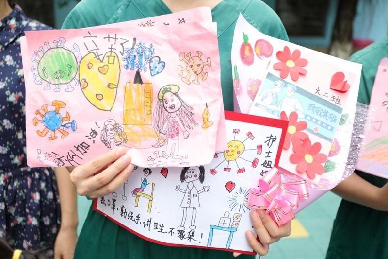 黎洋说妈妈的到来让他觉得很自豪,妈妈比他更勇敢。魏晨悦跟同学一起做了一束花送给前来支援的医护们,“妈妈跟我说过她是在帮我们抓病毒,我觉得妈妈和同事们都很辛苦,我想送给他们”。