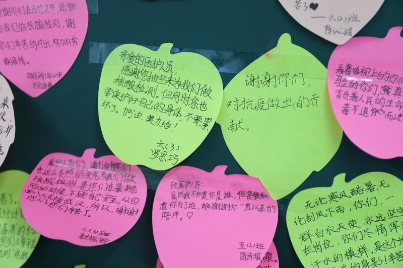 “虽然我不知道你是谁,但我知道你是在为中国人民的健康奋战”……一句句暖心的话语让人备感温暖。学生们还将他们的祝福创作成一幅幅感人的图画。