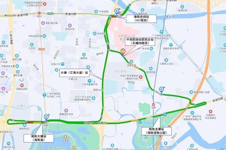 专线途经石榴岗路、江海大道中、新港东路、江海大道中、新滘中路、石榴岗路等路段,线路总站设在南方医科大学中西医结合医院,具体站点设置为:南医大中西医总站(石榴岗路西)—地铁8号线赤岗站(421医院)—大塘(江海大道)—地铁3号线大塘站(海珠湖)—地铁18号线龙潭站(海珠湿地公园)—南医大中西医总站(石榴岗路西)共五个站点,全程约35分钟,服务时间为周一至周日07:00-10:30;15:30-19:00,全天发班间隔不大于20分钟。