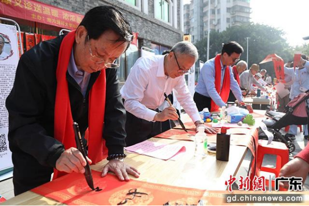 活动现场,潮联书画院年届耄耋、享受国务院特殊津贴的著名“军旅书画家”廖宗怡老师、广州市书法家协会常务副主席陈春盛老师、书法家陈俊生老师、许芝基老师等九位知名书法家,和南方中西医资深专家、援外科威特,荣膺“皇家医官”,擅长隶书创作,医书双栖的汪青春教授(骨伤科学术带头人)挥毫泼墨、笔走龙蛇,一副副饱含年味、寓意吉祥的春联和福字跃然纸上,藉着清新墨香传递温暖与祝福。