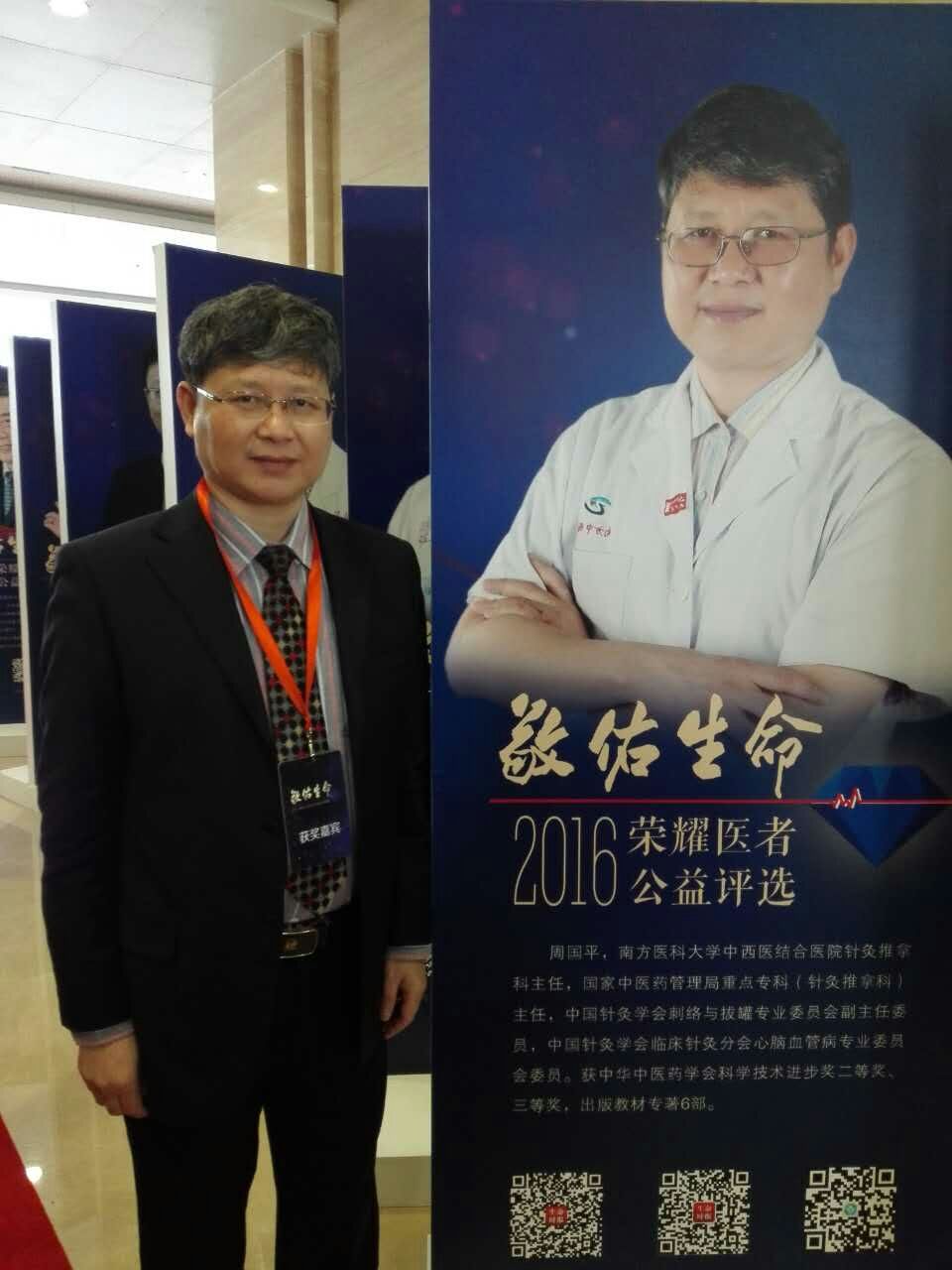 2016年12月26日,由《环球时报》社、《生命时报》社主办的“敬佑生命· 2016荣耀医者”公益评选颁奖典礼在北京盛大举行,南方医科大学中西医结合医院针灸推拿科(传统疗法与康复医学中心)主任周国平教授荣获“专科精英奖”。来自医学界、企业界、媒体界的400余人齐聚北京,共同向医者致敬,向生命致敬!全国人大常委会副委员长兼秘书长王晨、人民日报社总编辑李宝善、国家卫生与计划生育委员会副主任王贺胜出席并致辞。