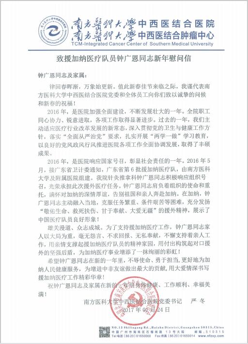 希望钟广恩同志在新的一年里,不辱使命、勇于担当,更好地为加纳人民健康服务,为增进中非友谊做出最大的贡献,用大爱情深书写援加纳医疗工作精彩华章!