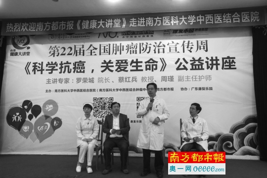 日前,全国肿瘤防治周期间,南方都市报与南方医科大学中西医结合肿瘤中心、广东康复乐园联合举办了南都健康大讲堂活动,讲座主题为“肿瘤防治,我们在行动”。活动邀请了南方医科大学中西医结合医院院长罗荣城、中西医结合博士蔡红兵、护理部主任周瑾为大家讲课。会场座无虚席,课堂气氛活跃,康复乐园的抗癌明星还分享了自己的抗癌经验。