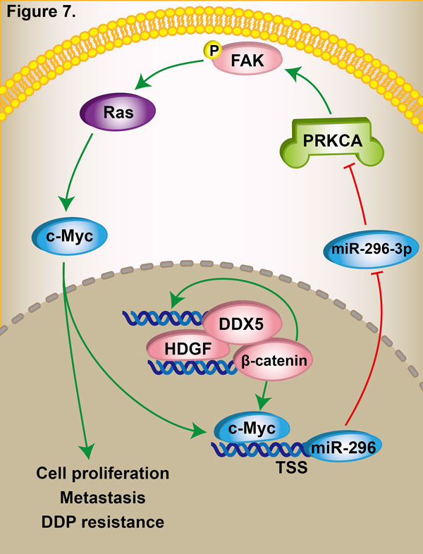该团队研究发现,miR-296-3p抑制肺腺细胞生长和转移并诱导顺铂化疗敏感性。机制分析显示,miR-296-3p通过直接靶击PRKCA,失活FAK/Ras/c-Myc信号,并反馈诱导自身表达,形成变异环路。研究发现,HDGF、DDX5和β-catenin之间发生结合,形成复合物,从而调控miR-296-3p/PRKCA/FAK/Ras/c-Myc反馈环路,促进肺腺癌发病过程。研究探讨了miR-296-3p在肺腺癌中的表达以及与临床参数和预后的关系,并分析了其与PRKCA、HDGF和c-Myc在肺腺癌的表达相关性。此课题是在国家自然科学基金委与云南省联合基金(No.U1502222)和广东省自然科学基金重点项目(No.2015A030311005)下完成的。该团队的研究成果为肺腺癌发生发展的分子机制研究提供了新思路,可能为肺腺癌治疗提供新的靶点。
