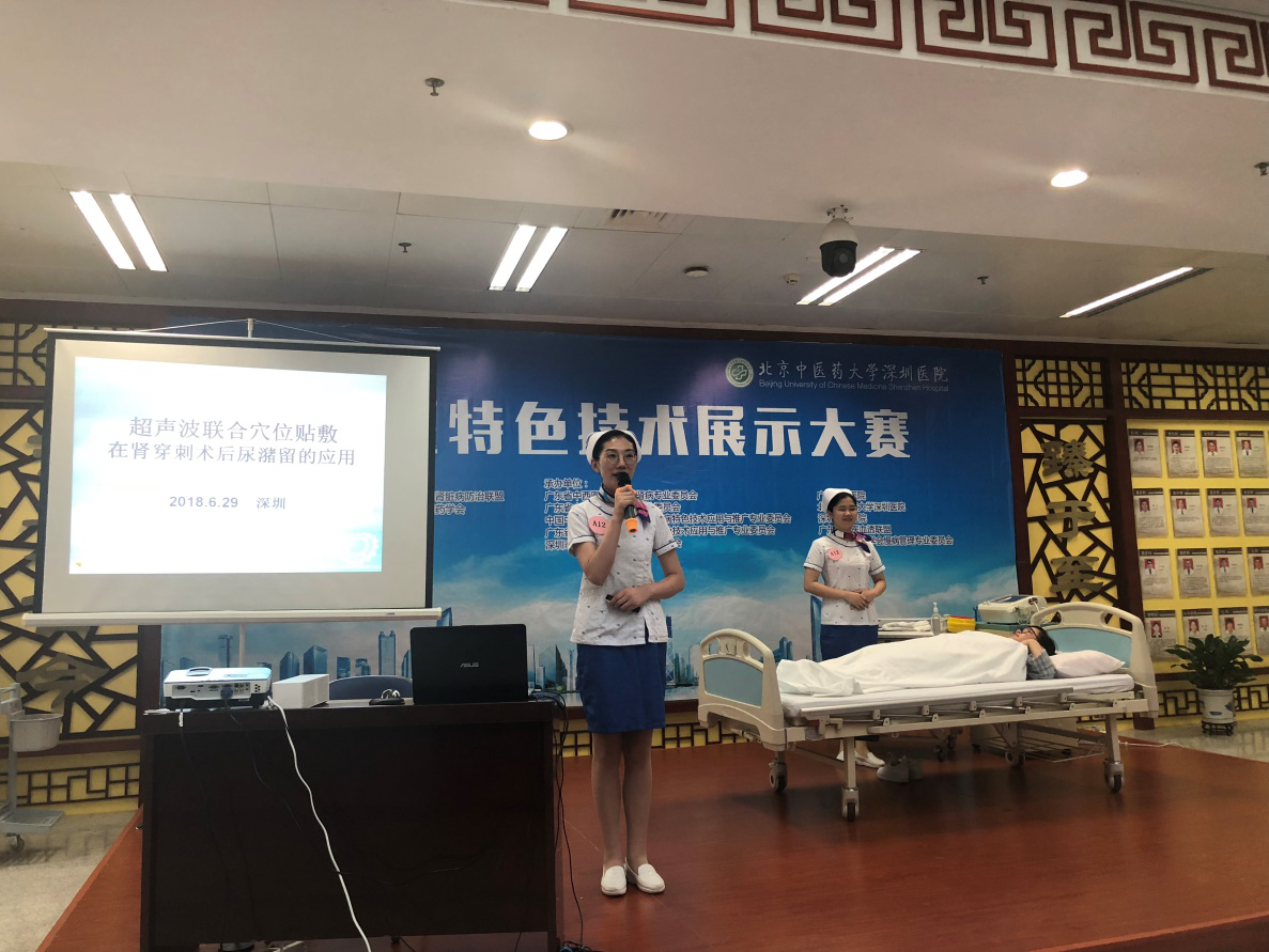 本次“中医特色技术展示大赛”评选活动,全国共60余项优秀项目入围参选。经过3个月的激烈角逐,通过医院报送、网络投票、专家评审、现场操作演示等严谨程序,最终,我院肾病护理单元的“超声波联合穴位贴敷在肾穿刺术后尿潴留的应用”,在众多参赛项目中脱颖而出,荣获三等奖。此项目为我院肾病护理单元自主创新项目。该项目的应用,对解除肾穿刺术后尿潴留有显著疗效,大大减轻了患者的痛苦。