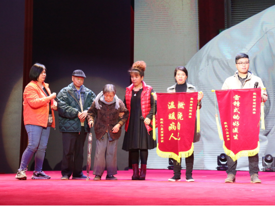 在现场访谈环节,一对耄耋老人在一位红衣大姐的搀扶下来到舞台上,他们要把写有“雷锋式的好医生”“燃烧自己,温暖别人”的锦旗送给贺主任。原来他们都是贺主任的“铁杆粉丝”病人,自从第一次在南方医科大大学中西医结合医院找贺医生看病,就深深被贺医生的高明医术和对病人高度负责的精神所打动。渐渐地患者变成了朋友,家里有人生病就会第一时间致电贺主任咨询,就像自己的家庭医生、健康顾问一样。十余年过去,他们都把贺医生早已当成亲人了,得知贺医生再次生病非常伤心,在心里为他祈祷,也不止一次到病房看望。