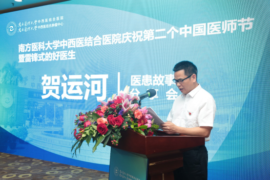8月16日上午,关于我院贺运河同志的“雷锋式的好医生贺运河医患故事分享会”在华泰宾馆国际厅成功举办。广东省文明办副主任吴祖清,南方医科大学党委副书记昌家杰等领导出席分享会。人民日报等30多家省内外媒体记者、贺运河家属及患者,我院严冬书记、李爱民院长、相关科室负责人及贺运河学雷锋医疗志愿者服务队代表等参加活动。分享会由我院党委副书记马镇国主持。