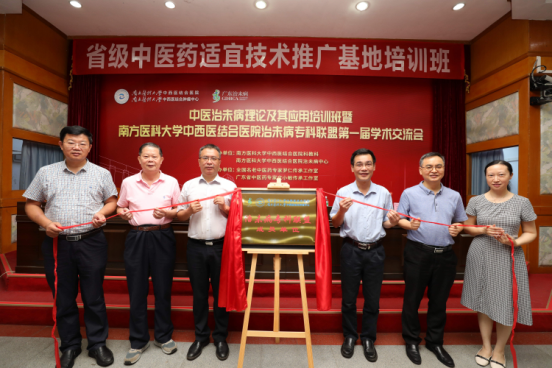 柯忠副局长(右三)、李爱民院长(左三)、罗仁主任(左二)、王昌俊主任(右二)、林嬿钊主任(右一)、文小敏主任(左一),共同为“南方医科大学中西医结合医院治未病专科联盟”揭牌。