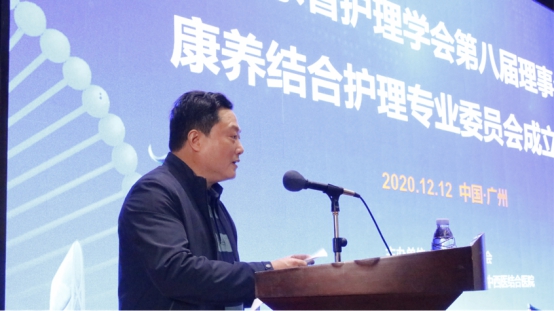 广东省护理学会周丽华秘书长致辞,并代表广东省护理学会对专委会的成立表示热烈祝贺,康养结合护理专业委员会是由南方医科大学中西医结合医院牵头,联合南方医院、广东省中医院、广东省第二人民医院、广州中医药大学第一附属医院等多家三甲医院共同发起成立,为护理学会注入了新鲜血液,增添了新的活力,希望该专委会集众家之长,集中优势,精准发力,引领康养结合护理专业理论知识系统化、专科技能标准化、健康管理立体化、延续服务规范化的发展。