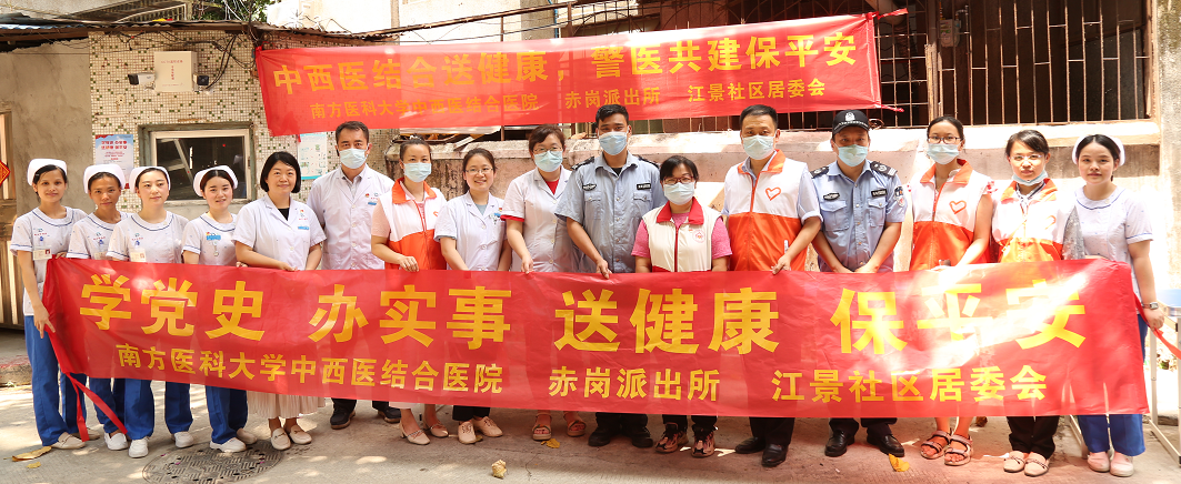 机关第一党支部、肿瘤中心党支部、机关职能团支部、肿瘤中心团支部联合赤岗派出所、江景社区居委会以“中西医结合送健康,警医共建保平安”为主题,到当地开展“我为群众办实事”实践活动。