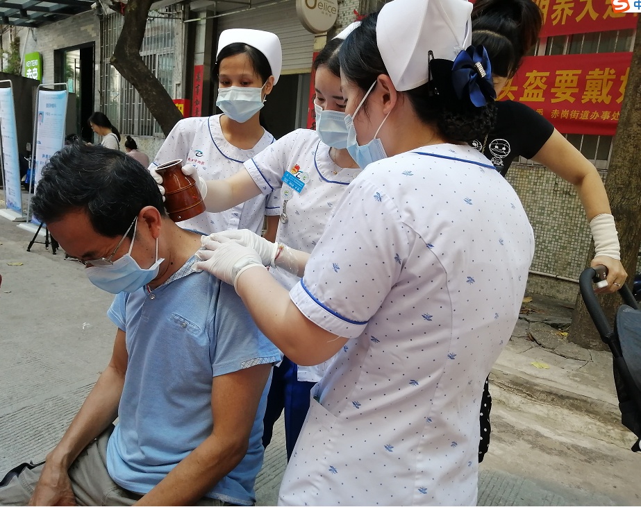 医院医护人员为居民提供疾病咨询和用药指导,测血糖、量血压及耳穴压豆、刮痧、艾灸等中医护理操作。考虑到近期广州天气炎热,免费将医院自制的清暑益气凉茶300包发给居民。