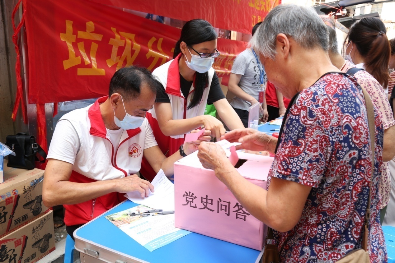 居委会工作人员组织开展党史知识有奖问答,宣传垃圾分类知识。
