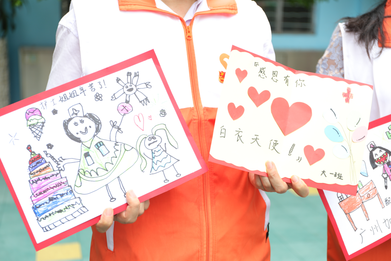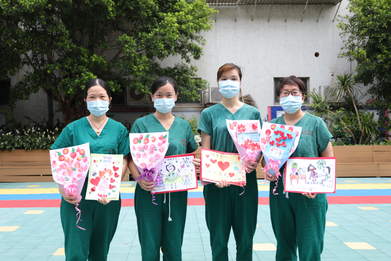 18名护理人员中,大多数当了妈妈,他们的孩子也在其中上小学、幼儿园。当看到赤岗东小学的孩子们用手语表演 “听我说谢谢你”以及精心准备的留言 “感恩墙”,“妈妈”采样团忍不住眼眶湿润。“虽然我不知道你是谁,但我知道你是在为中国人民的健康奋战”……一句句暖心的话语让人备感温暖。学生们还将他们的祝福创作成一幅幅感人的图画,其中有一幅“白衣天使”漫画特别醒目,是两位六年级的小朋友合作而成,问他们为什么会有这么新奇的创意,他们说自己的爸爸是军人,平时看起来很安静,但一旦有紧急任务就冲锋陷阵,很勇敢的!他们觉得医护工作人员也一样,在疫情面前就是救死扶伤的天使,保护人们健康,很伟大。