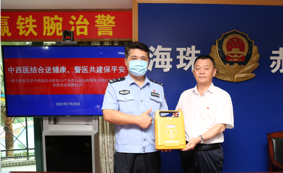 为关心关爱民警的身体健康,提升应急救治水平,密切警医共建,南方医科大学中西医结合医院向广州市公安局海珠分局赤岗派出所赠送半自动体外除颤器(AED)等急救用品。7月29日上午,捐赠仪式在赤岗派出所举行,医院党委书记严冬、党委副书记皮玲、相关科室负责人,赤岗派出所所长冯荣炜、教导员卢维锋、副所长许骋和林学宜及民警参加。