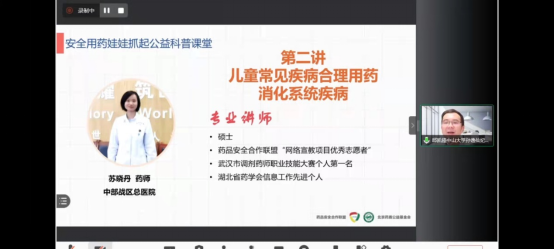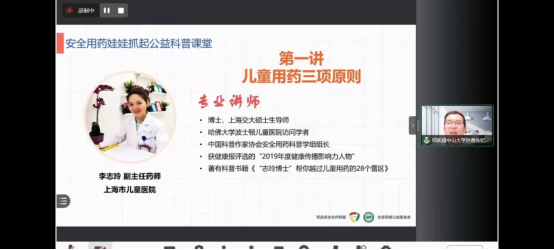 9月1日,由药品安全合作联盟(PSM)、北京药盾公益基金会主办,广东省药学会、药品安全合作联盟(广东)、南方医科大学中西医结合医院药学部承办的“安全用药 娃娃抓起”2021儿童安全用药公益科普线上讲座广东省站正式开讲。上海市儿童医院药学部李志玲副主任、中部战区总医院药学部苏晓丹药师分别进行授课,广东省妇幼保健院王穗琼主任、中山大学附属第三医院粤东医院麦海燕副主任、中国人民解放军南部战区总医院彭海莹副主任等答疑嘉宾参会。讲座由中山大学孙逸仙纪念医院邱凯锋主任主持,幼儿园、小学、社区等机构受邀的家长及PSM志愿者观看了此次网络直播讲座。