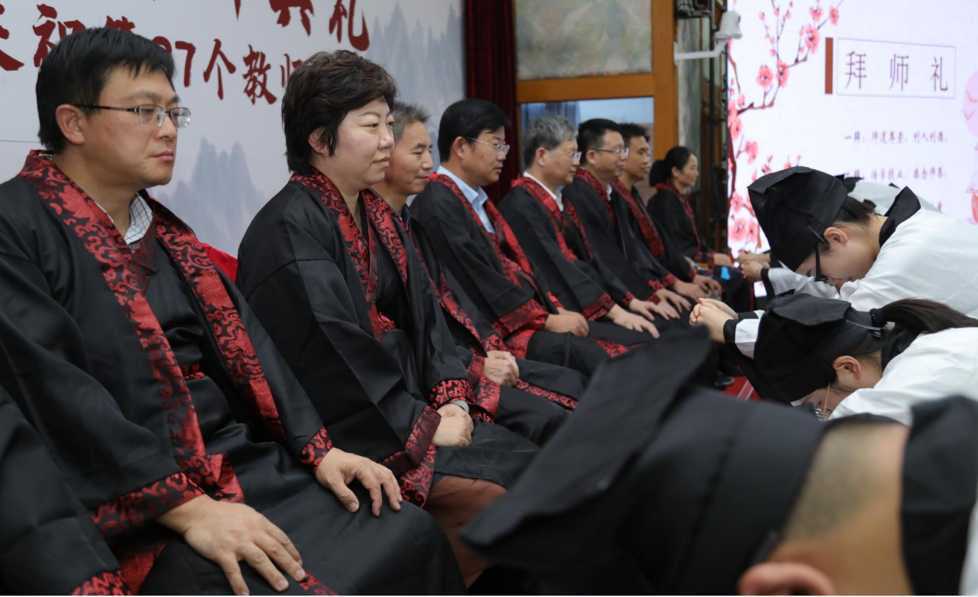 拜师典礼现场庄严肃穆,10名弟子向师承导师行跪拜礼、递交“拜师帖”,奉赠束脩六礼,呈敬礼茶,表达了对老师的敬意,答谢老师收于门下,也表明了自己发奋努力、立志继承老师学术思想的决心。
